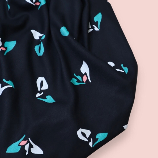 Crepé de viscosa Ecovero™  con estampado en colores blanco y verde sobre fondo negro.  Un tejido muy suave y ligero, algo satinado y de alta calidad, para prendas con caída y movimiento.