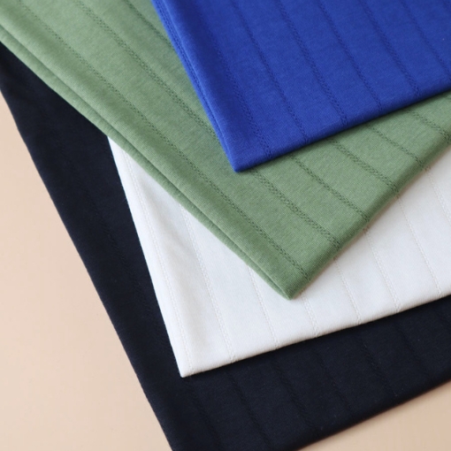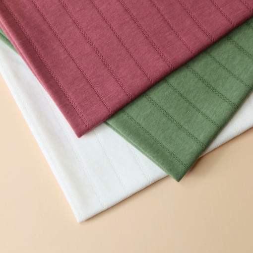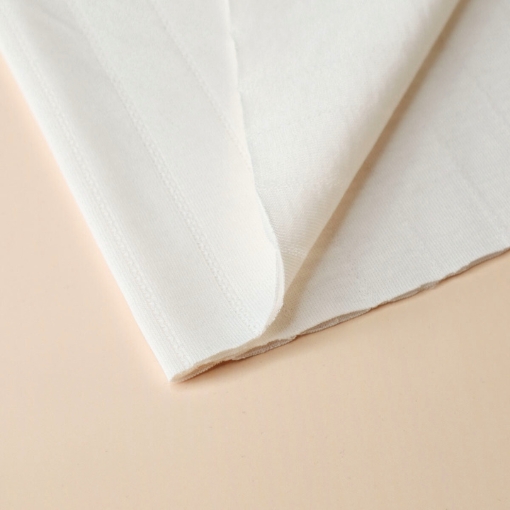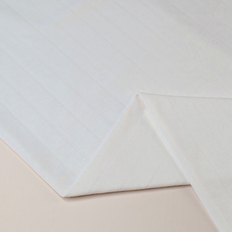 Jersey de algodón orgánico con calado en forma de rayas en color blanco crema.  Está confeccionado con una técnica especial de doble capa, en la parte externa tiene el delicado aspecto del pointelle y en la interna tiene una suave capa para mantener el tejido opaco.