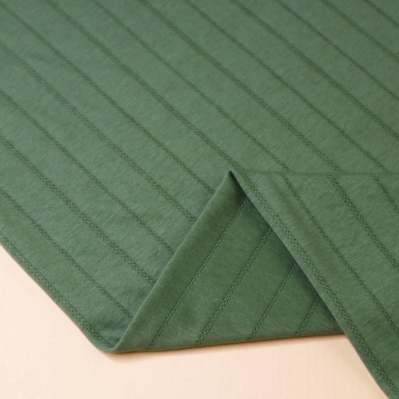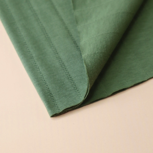 Jersey de algodón orgánico con calado en forma de rayas en color verde oliva.  Está confeccionado con una técnica especial de doble capa, en la parte externa tiene el delicado aspecto del pointelle y en la interna tiene una suave capa para mantener el tejido opaco.