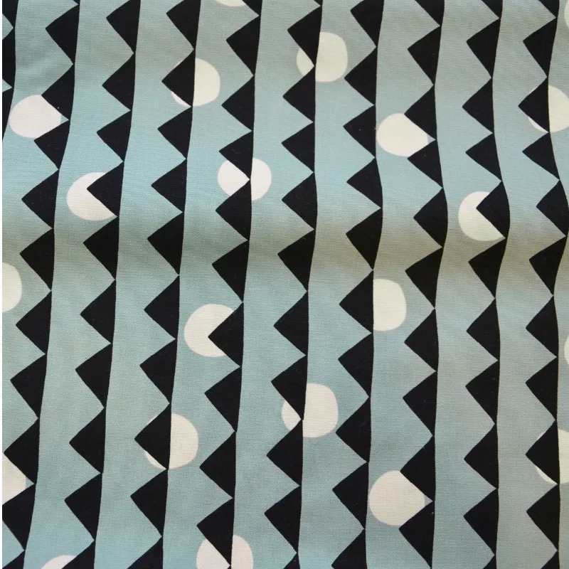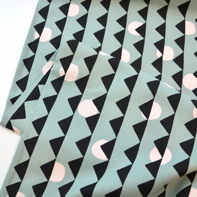 & Free ShippingCanvas de algodón orgánico con estampado que simula las montañas y el movimiento del sol sobre fondo azul agua. Es un tejido de peso medio, tacto suave y muy versátil.