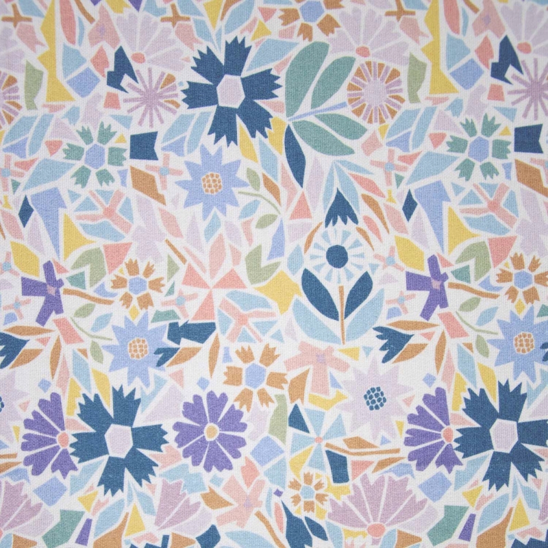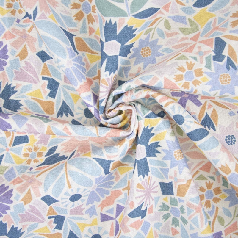 Canvas de algodón con estampado de flores en tonos azul, lila, naranja y rosa. Un diseño colorido en tonos suaves, ideal para complementos y decoración del hogar.
