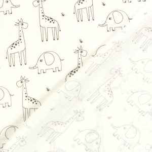 Sumérgete en un mundo de ternura y aventura con nuestra muselina de algodón. Presenta un encantador estampado de siluetas de jirafas y elefantes en un delicado tono gris sobre un suave fondo blanco roto. Su textura arrugada y ligera, característica de la doble gasa, la hace perfecta para confeccionar prendas cómodas y adorables para los más pequeños. Ideal para arrullos, ropa de cuna, vestidos y blusas con un toque safari.