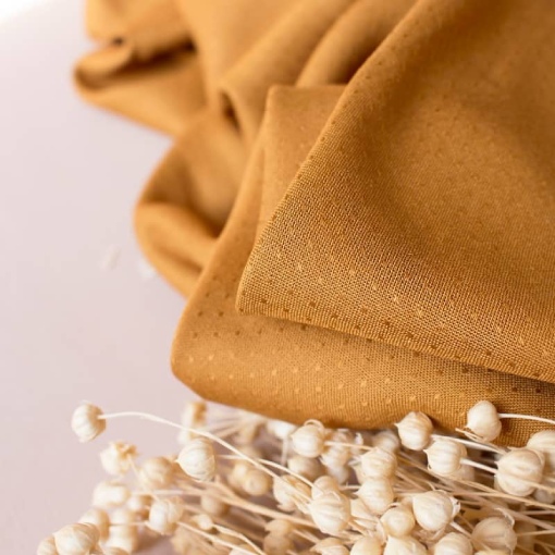 Plumeti de viscosa Ecovero de color ocre con caída fluída y tacto muy suave. Los delicados puntos bordados le darán un toque delicado y romántico a tus prendas.