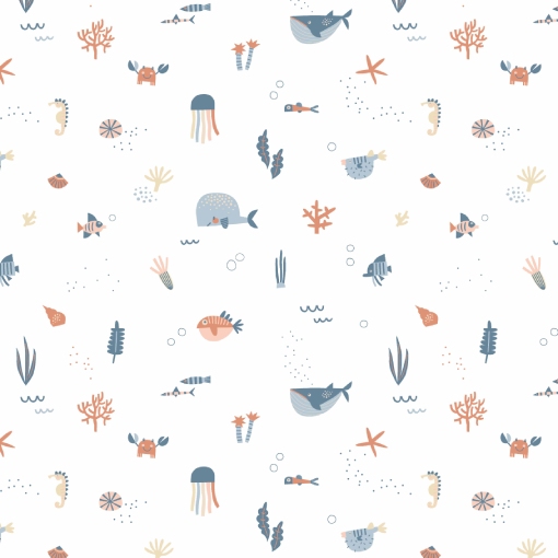& Free ShippingTejido de algodón orgánico tipo popelín con estampado infantil de animales marinos en tonos azules y naranjas sobre fondo blanco.