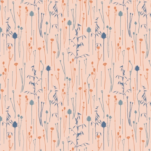 & Free ShippingPopelín de algodón con estampado de pequeñas flores azules y naranjas sobre fondo rosa claro.