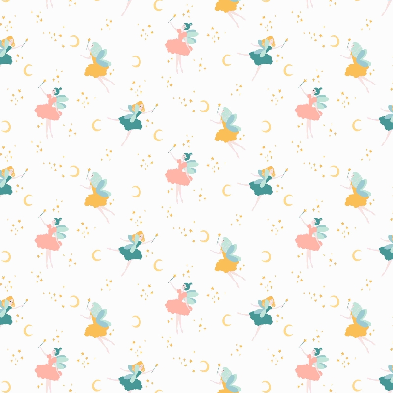 Popelín de algodón orgánico con dulce estampado de pequeñas hadas, lunas y estrellas sobre fondo blanco.