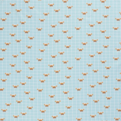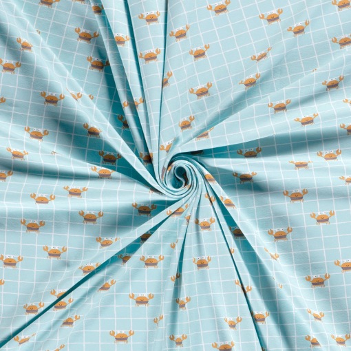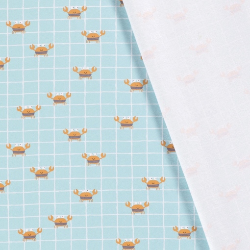 Tejido de punto de algodón con estampado de alegres cangrejitos y cuadros blancos sobre fondo menta.