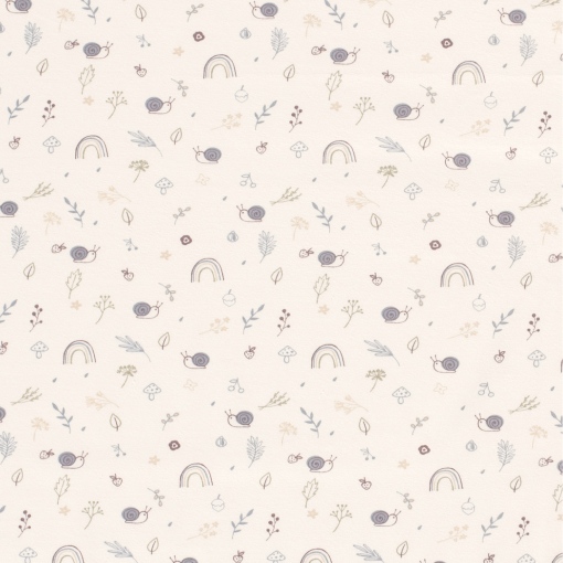 & Free ShippingTejido de punto de algodón con estampado infantil de caracoles, plantas y arcoiris en tonos suaves sobre fondo blanco roto.