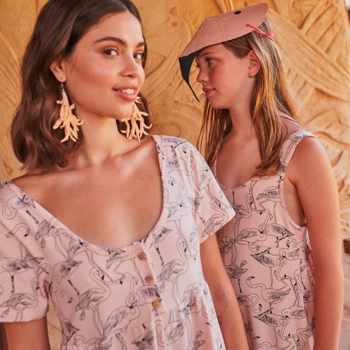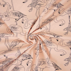 Tejido de punto de algodón con un original estampado de flamencos sobre fondo rosa claro. Divertido, suave y versátil para prendas cómodas y ligeras.