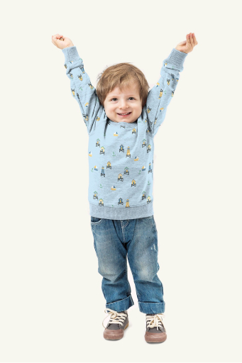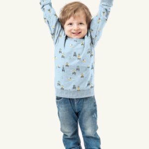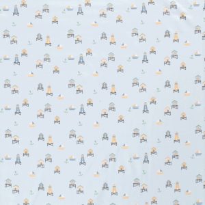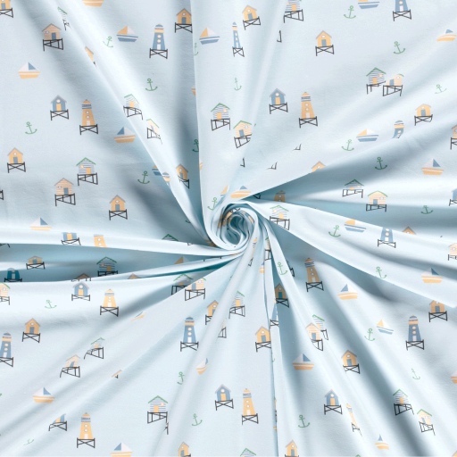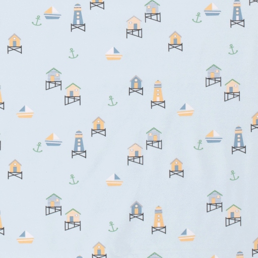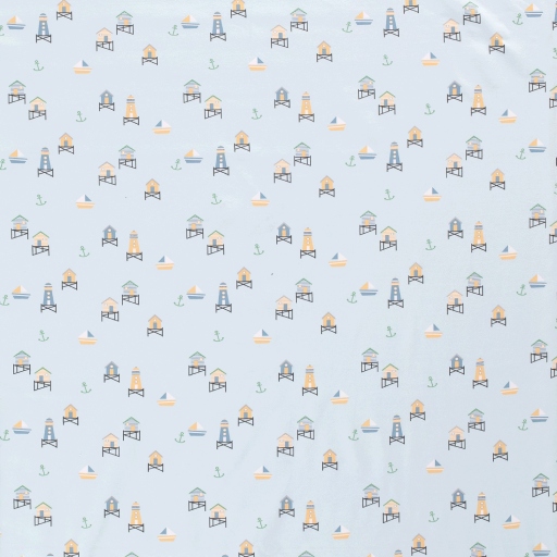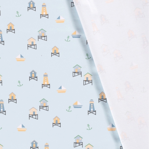 Tejido de punto de algodón con estampado de faros y casetas playeras en tonos suaves sobre fondo azul claro.