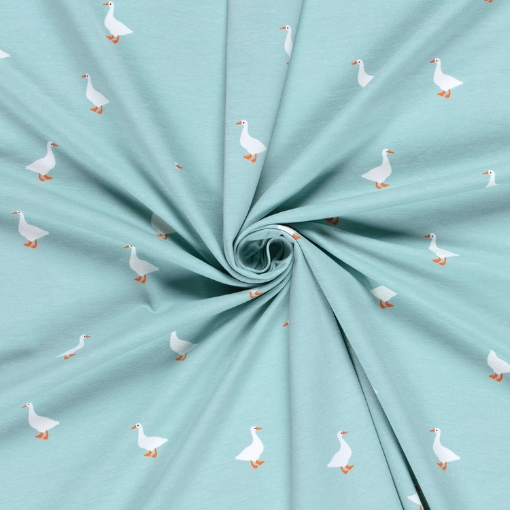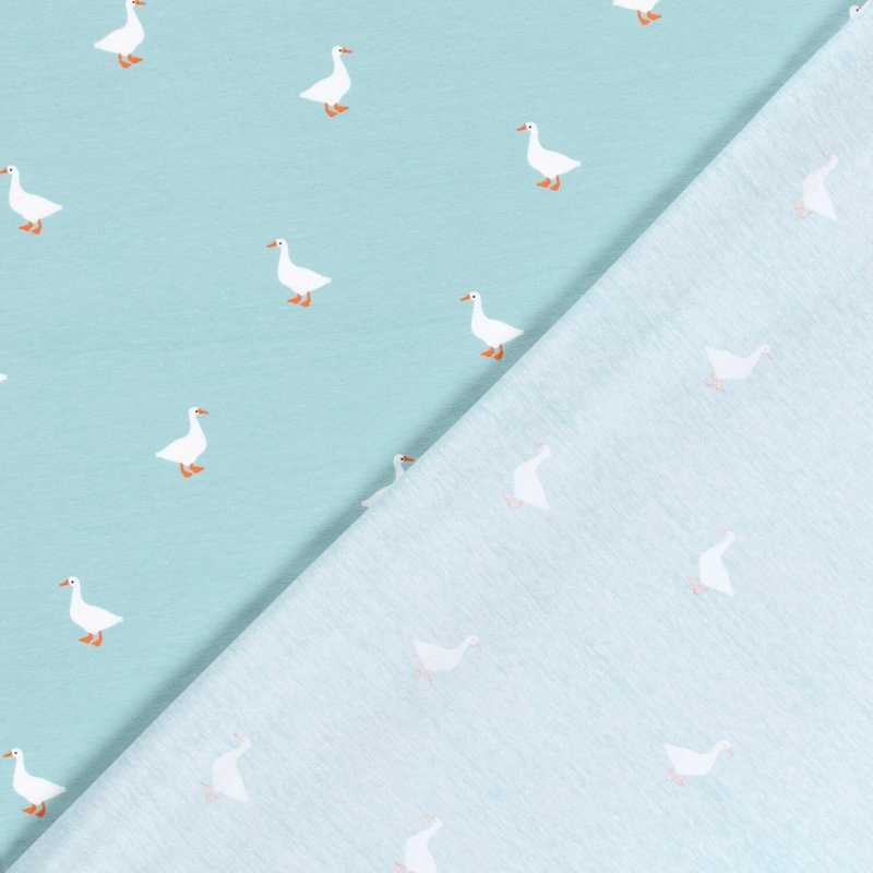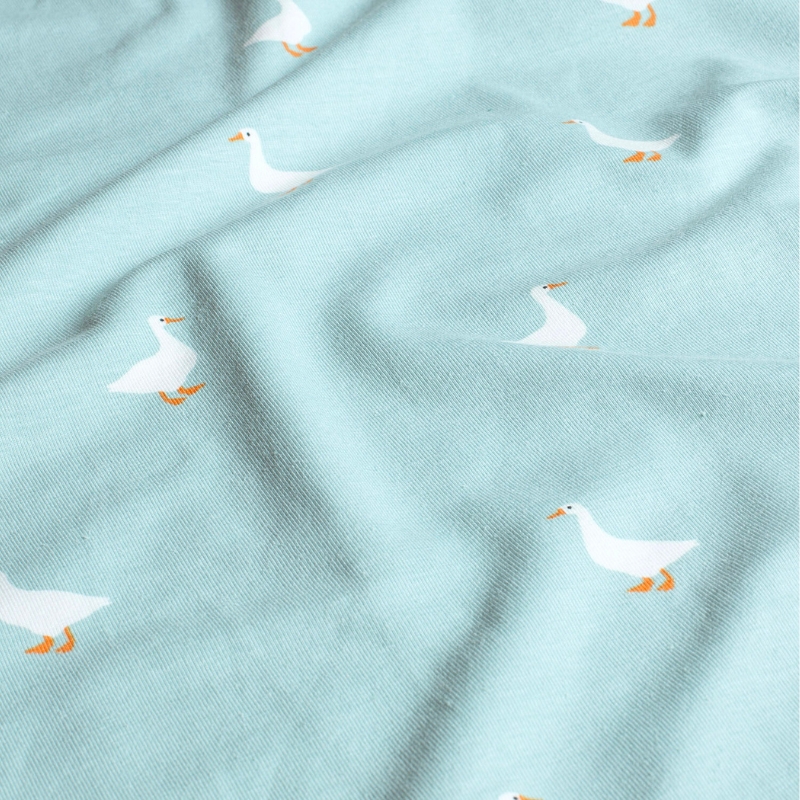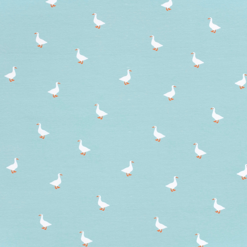 & Free ShippingTejido de punto de algodón con estampado de ocas sobre fondo azul claro. De tacto muy suave y agradable es perfecto para prendas delicadas y cómodas.