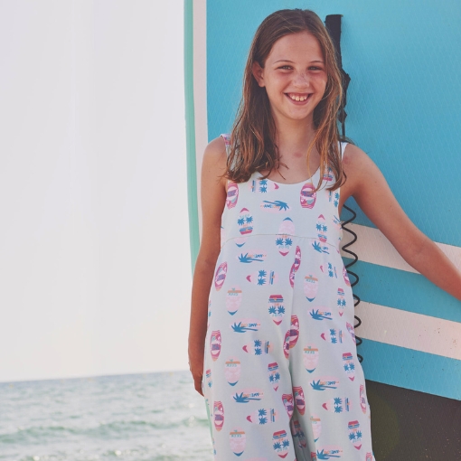 Tejido de punto de algodón con divertido estampado de tablas de surf en tonos azul aguamarina y rosa sobre fondo verde agua claro. Combina algodón y elastán lo que es garantía de suavidad y confort.