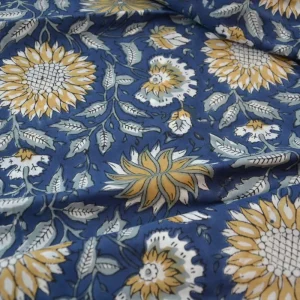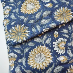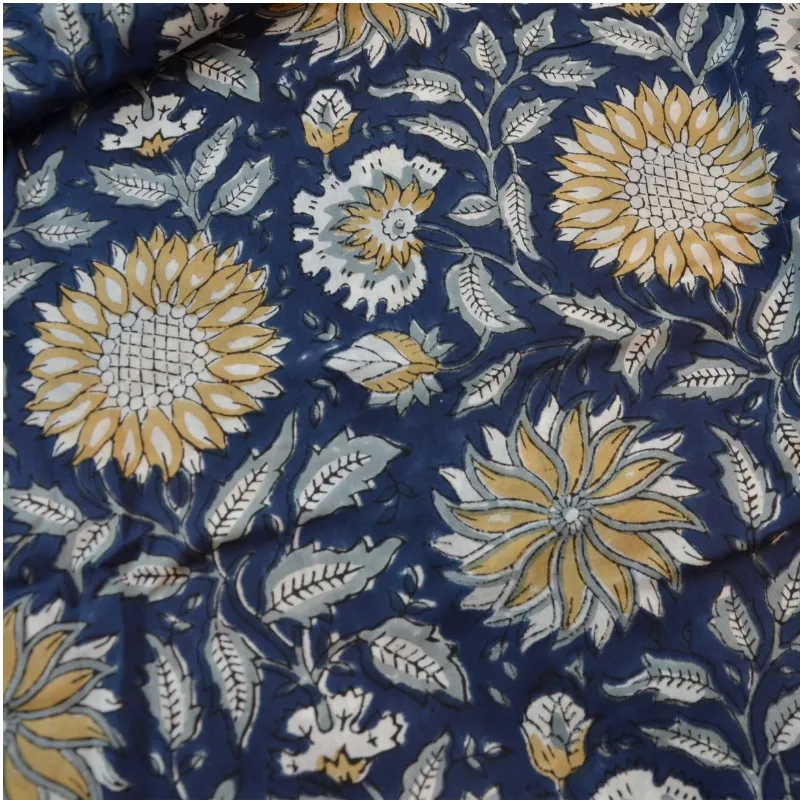 & Free ShippingTela de algodón indio estampada a mano con la técnica artesanal Block Print. Con un diseño único de flores amarillas sobre fondo azul oscuro es perfecta para proyectos de costura originales y únicos.