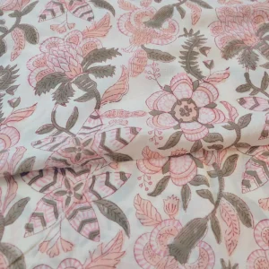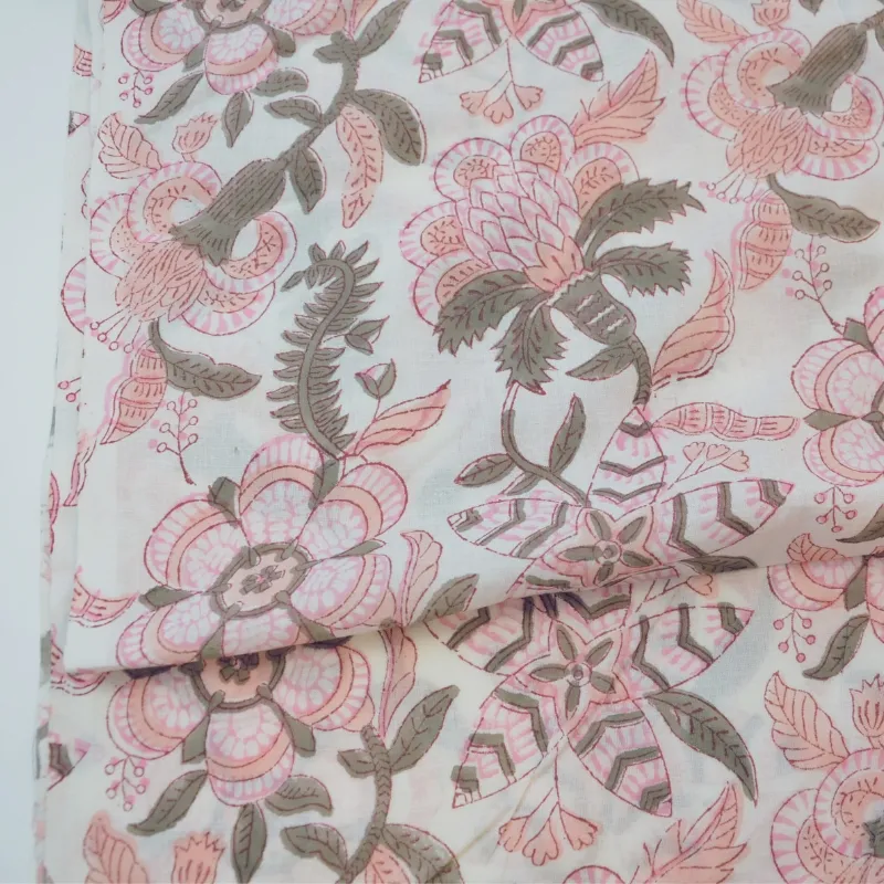 & Free ShippingTela de algodón india estampada a mano con la técnica artesanal Block Print. Con un delicado diseño único de flores en tonos rosas y verdes sobre fondo blanco es perfecta para proyectos de costura originales y únicos.
