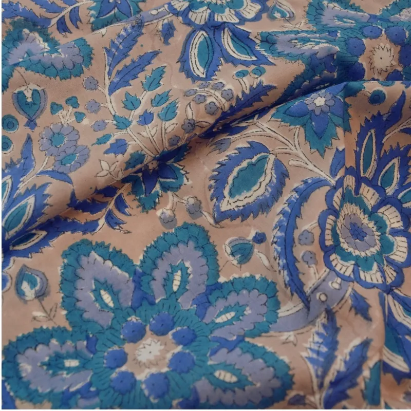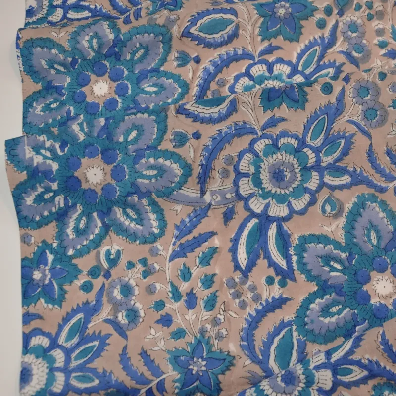 & Free ShippingTela de algodón india estampada a mano con la técnica artesanal Block Print. Con un diseño único de flores en tonos azules y blanco sobre fondo marron claro. Perfecto tanto para prendas frescas y ligeras como para decoración.