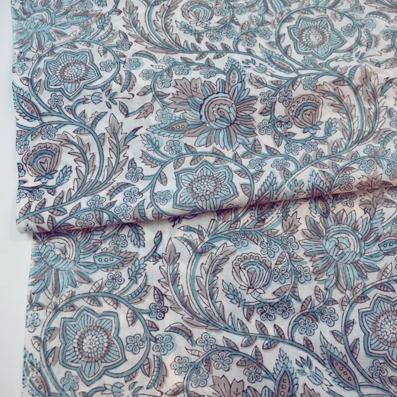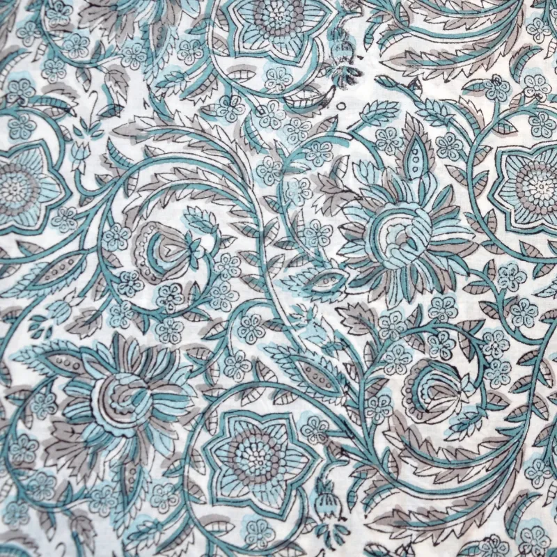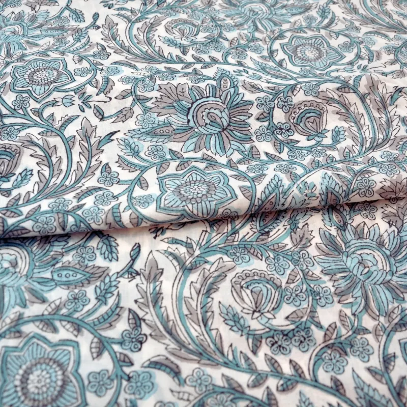 & Free ShippingTela de algodón india estampada a mano con la técnica artesanal Block Print. Con un diseño floral único en tonos turquesa y grises sobre fondo blanco. Perfecto tanto para prendas frescas y ligeras como para decoración.