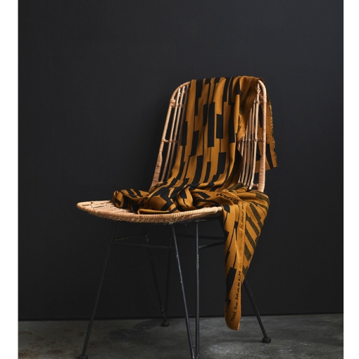 Twill de viscosa Ecovero™  con estampado geométrico de rectángulos y rayas desiguales en color negro sobre fondo ocre. Un tejido muy suave, ligero y opaco para prendas fluídas con mucha caída.