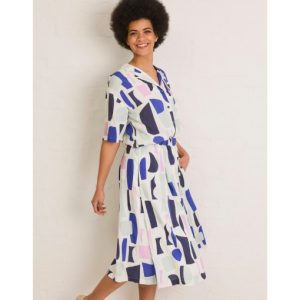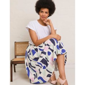 Tela de viscosa en color blanco con estampado de formas abstractas en azul, rosa suave y verde pastel. De tacto muy suave, fluida y ligera, ideal para prendas en las que se necesite mucha caída y se busque movimiento.