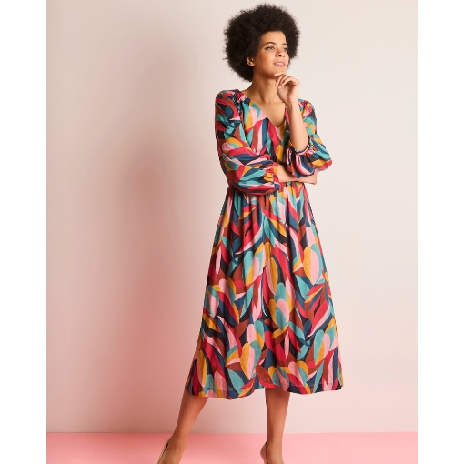 Tela de viscosa con estampado gráfico de hojas en colores suaves como rosa, rojo, turquesa, burdeos y azul. Tejido especialmente ligero, con un peso de 85 gr/m2.
