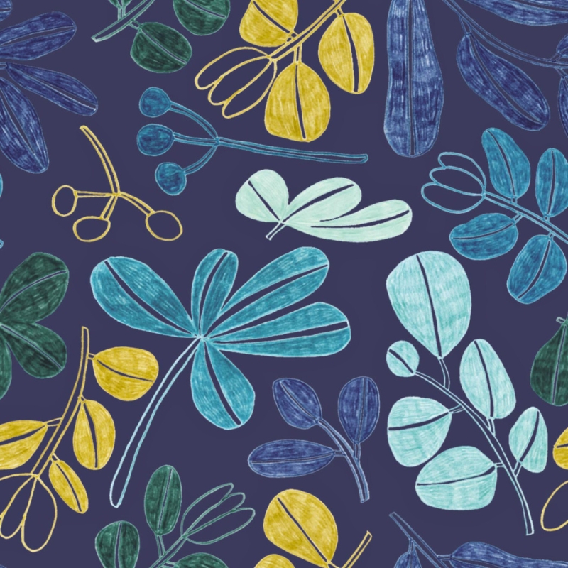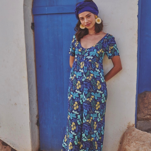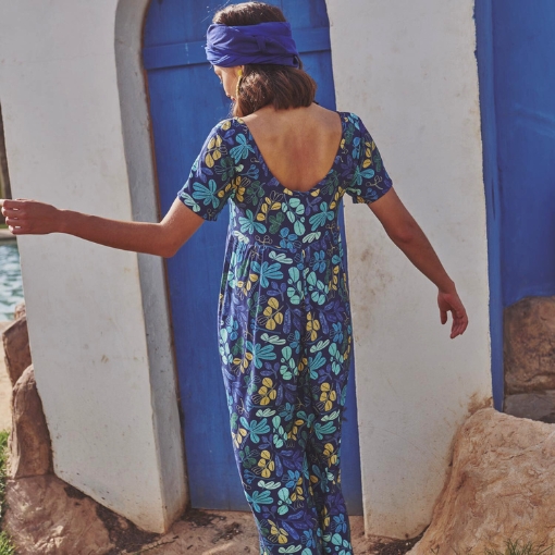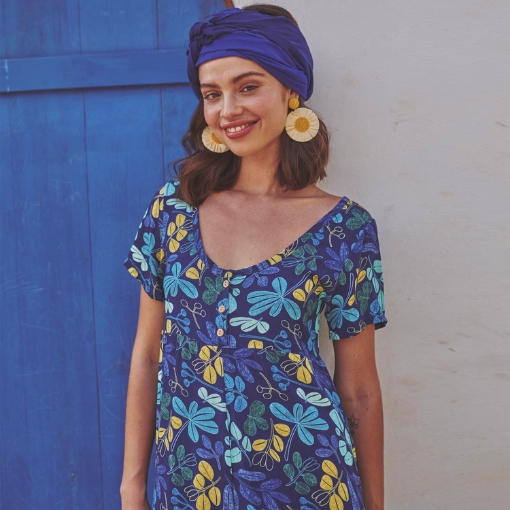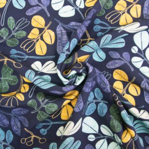 Tela de viscosa Ecovero™ con estampado de flores y plantas en tonos azules, amarillos y verdes sobre fondo azul marino. Suave, ligera y con mucha caída, es perfecta para prendas frescas y con movimiento. Puedes encontrar prendas confeccionadas con esta tela en la revista Travel Postalcards de Katia fabrics para la temporada primavera-verano 2024.