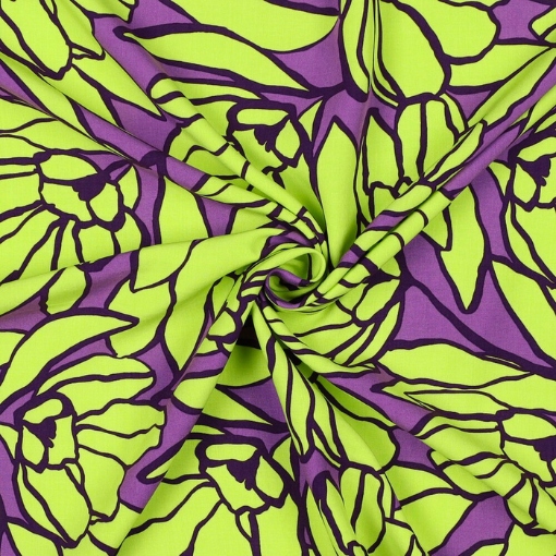 Tela de viscosa Ecovero™ con flores lima sobre fondo lila. Este alegre estampado pertenece a la última colección de Nerida Hansen impreso sobre una viscosa muy suave con mucha caída ideal para prendas veraniegas.
