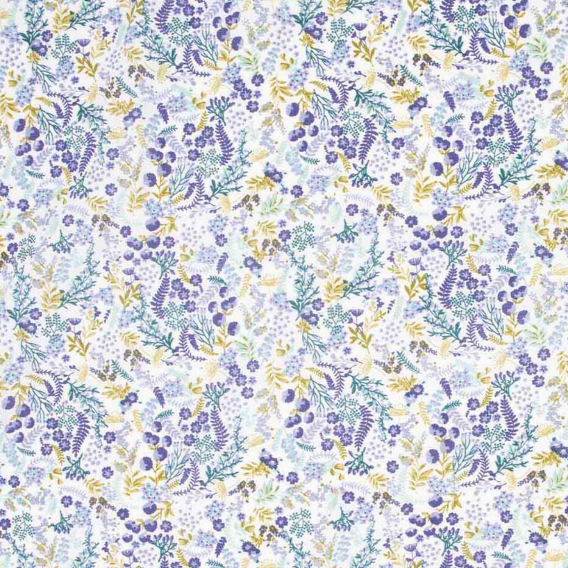 Voile del algodón con estampado de pequeñas flores en tonos lilas y verdes sobre fondo blanco.