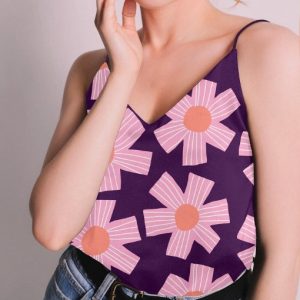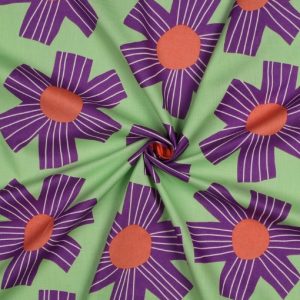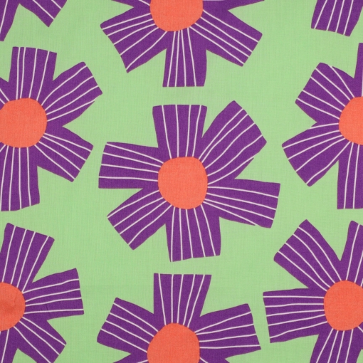 Voile del algodón con estampado de flores moradas sobre fondo verde que forma parte de la colección de Nerida Hansen.